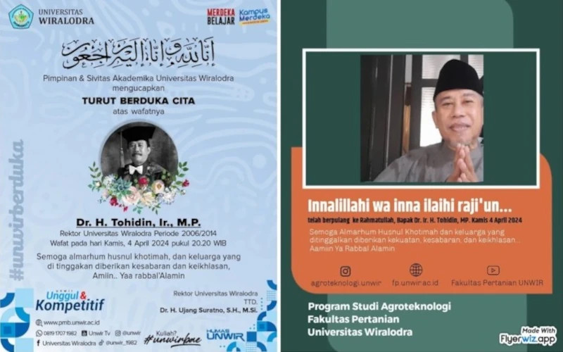 Innalilahi wa innna ilaihi raji’un. Telah berpulang ke rahmatullah Bapak Dr. Ir. H. Tohidin, M.P. (Dosen Fakultas Pertanian) pada hari Kamis, 4 April 2024 pukul 20.20 WIB. Selama pengabdiannya almarhum aktif memajukan Universitas Wiralodra dan Fakultas Pertanian. Tercatat, almarhum pernah diamanahkan sebagai Rektor selama dua periode, pada tahun 2006 sampai dengan 2014, Ketua Senat Universitas Wiralodra, Direktur Pascasarjana Universitas Wiralodra, Dekan Fakultas Pertanian, dan Pembina Pramuka Kabupaten Indramayu.