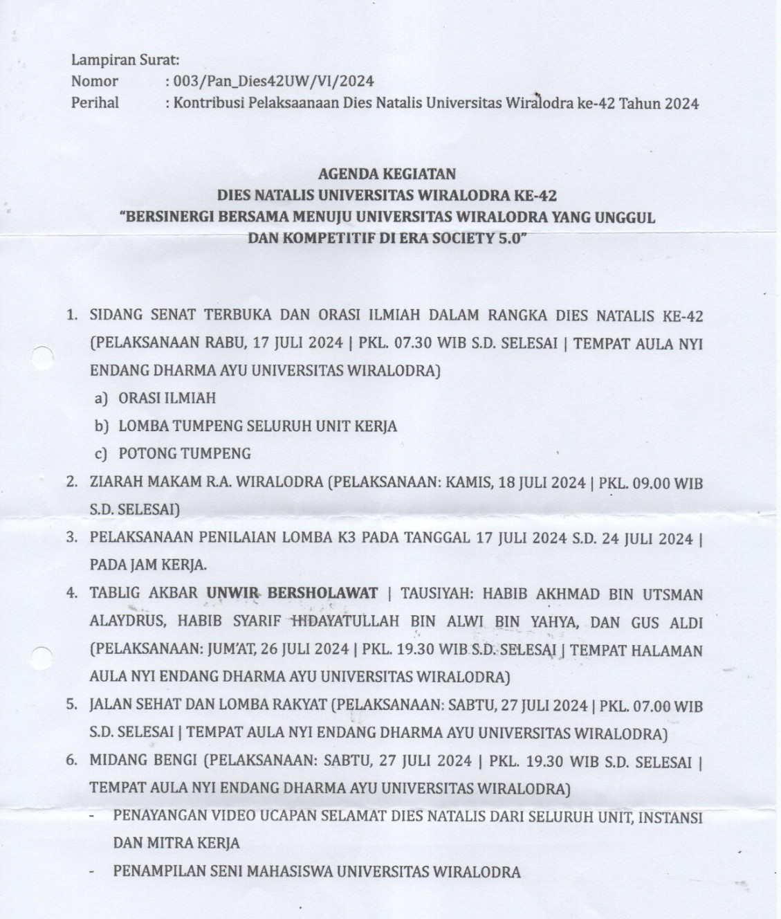 Pada hari Kamis ini, tanggal 17 Juli 2024, Universitas Wiralodra merayakan ulang tahun yang ke-42. Serangkaian acara dan kegiatan telah disusun oleh Panitia Dies Natalis XLII dalam rangka memeriahkan ulang tahun tersebut, dimulai dengan acara Sidang Terbuka Senat Universitas Wiralodra dalam Rangka Peringatan Dies Natalis ke-42 Univesitas Wiralodra Tahun 2024, sebagaimana tercantum pada gambar di bawah ini.