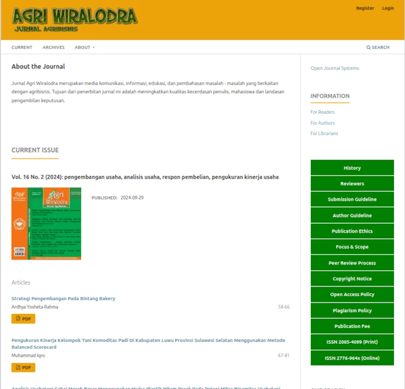 Jurnal Agri Wiralodra terbit pada bulan Januari dan Juli, dengan ruang lingkup: pengembangan pertanian, pengelolaan pertanian, kebijakan pertanian, penyuluh pertanian, pemasaran hasil pertanian, sistem agribisnis, perdagangan internasional, komunikasi agribisnis dan pemberdayaan sosial serta pembangunan pedesaan. Jurnal ini dikelola sejumlah dosen dan bertindak sebagai Editor in Chief (Ketua Dewan Redaksi) adalah Arsy Nur Fadilah, S.P., M.Sc.